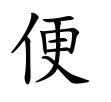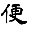 - #2人+更。更に更改の意がある。金文の𩣓(ぎょ)は馬に鞭度(べんたく)を加える形であるが、その𩣓の従うところは更の字形に近く、便とは人に鞭度を加える意象の字であろうと思われる。ゆえに人を駆使する意となり、便利捷給の意となる。更は変更・更改の意で、もとその呪的な方法を示す字であった。鞭度を加えて祓い、安堵することから、他の諸義が生じたものであろう。(字通)