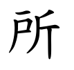 戶(戸)+斤(きん)。戶は神位を蔵する所の戸、その前に呪鎮として斧鉞の類をおく。聖所・霊廟の意。関係代名詞や受身に用いるのは後起の用義法で、音の仮借。(字通)