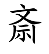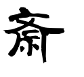 - #7旧字は齋に作り、齊(斉)(せい)の省文+示。齊は神事に奉仕する婦人が、髪に簪飾(しんしよく)を加えている形。示は祭卓。祭卓の前で神事に奉仕することを齋といい、また䶒(さい)という。(字通)