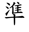 +音符淮。隹は下体の太った水鳥の象形、淮は水がずっしりと下にたまる意。準は下にたまって落ち着いた水の水面を基準として高低をそろえること。(漢字源)