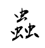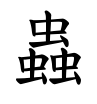三虫に従う。小さな虫の集まる形。蟲は蛇や昆虫類、また羽毛鱗介のものを含めていうこともある。いま略字として用いる