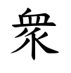 #2目+三人。目は古くは(い)の形に作り、邑の外郭、これに三人を列して衆となり、邑人をいう。卜文の字形に囗を日の形にしるすものがあるが、囗に従う字形の方が多い。(字通)